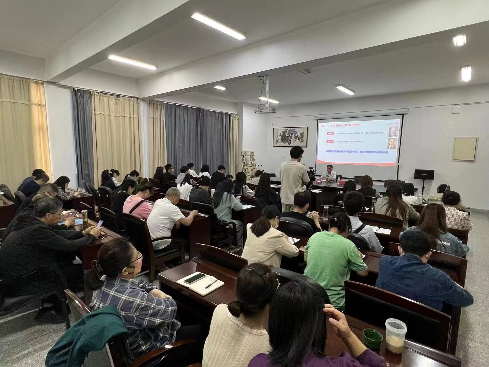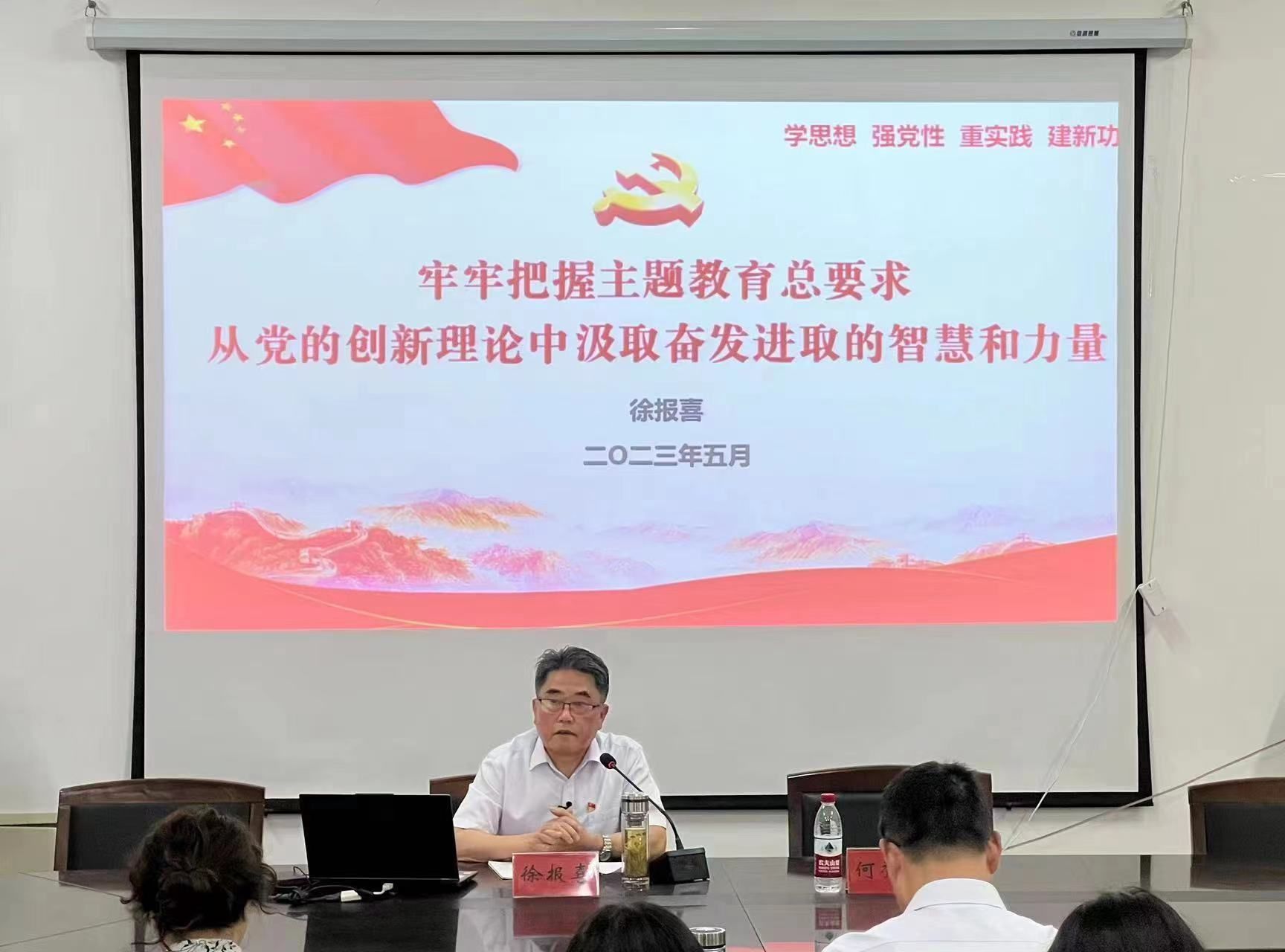 徐报喜分别从“牢牢把握主题教育总要求”“深刻领会和把握习近平新时代中国特色社会主义思想活的灵魂”“将主题教育成果展现在全面提升办学水平新成效上”三个方面,对深入开展主题教育的重大意义与实践要求进行了详细解读。报告主题鲜明、重点突出、内涵深刻,既有层层递进的理论思考,又有经验丰富的工作指导,体现了很强的思想性和实践性,对进一步引导广大教师以德立身、以德立学、以德施教,落实立德树人的根本任务具有很强的指导意义。