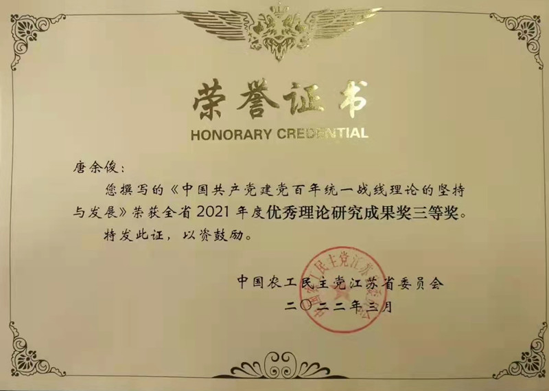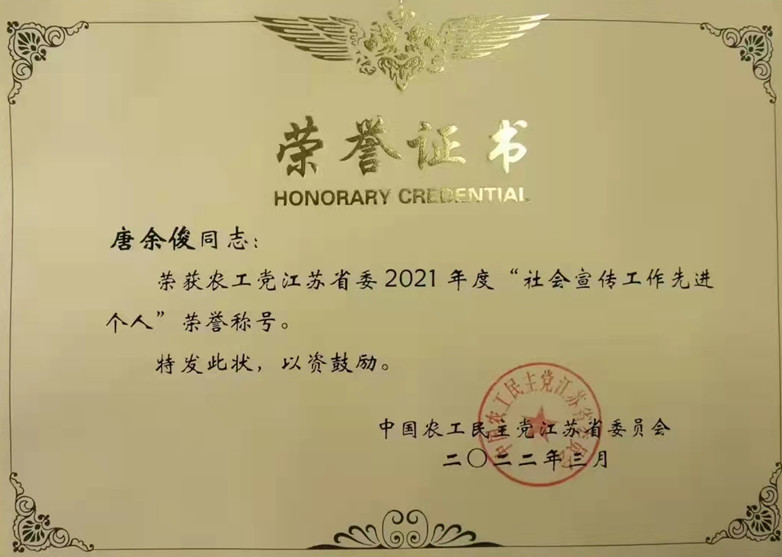 近日,在中国农工民主党江苏省委员会召开的2022年党务工作会议上,公司民主党派成员唐余俊被评为2021年度“社会宣传工作先进个人”,所撰写论文《中国共产党建党百年统一战线理论的坚持与发展》获“优秀理论研究成果奖三等奖”。