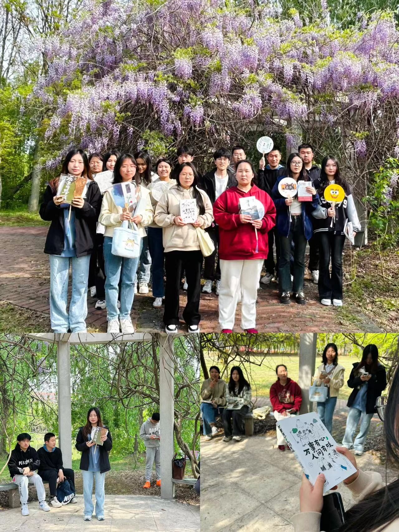 分享会上,同学们围坐在紫藤花亭中,饶有兴致地交流了近期阅读的文学名著、科普读物,互相分享阅读感悟。从黄沙漫漫的敦煌戈壁到温婉怡人的江南小镇,《文化苦旅》展示了一座座古迹遗址背后蕴含的动人篇章;从古代文明的诞生伊始到中华文明的现代化转型,《历史的暗线》镌刻了一幅幅生动而鲜明的历史画卷;《孙子兵法》又让同学们感受到古代兵家思想的深邃精辟与斐然文采……同学们相聚在紫藤花瀑布下,以书会友,畅所欲言,共同享受阅读带来的精神愉悦及人生的智慧启迪。