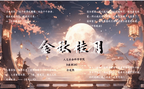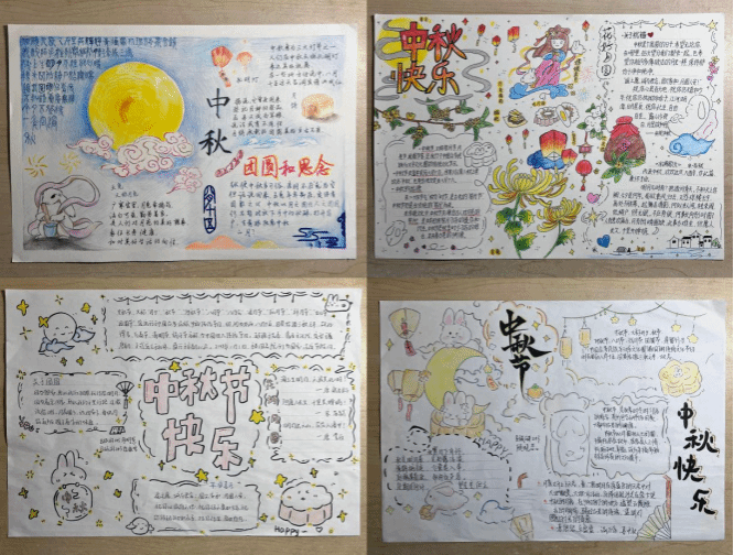 本次活动富有创新性,以设计手抄报与电子海报为参赛形式,兼具学问性与欣赏性,旨在让同学们体验到中秋节传统文化的魅力,感受温馨美好的校园氛围。各班级积极参与,精心构思,巧妙设计,最终呈现出的作品各有特色。在手抄报作品中,同学们以诗歌为载体,用图案点缀,勾勒出中秋佳节的生动画卷。电子海报作品则运用数媒技术,融合中秋传统元素与现代流行元素,古典传统又时尚新颖。同学们纷纷表示通过此次活动,对中秋节有了更全面的了解,感受到浓厚的节日氛围,更坚定了文化自信。