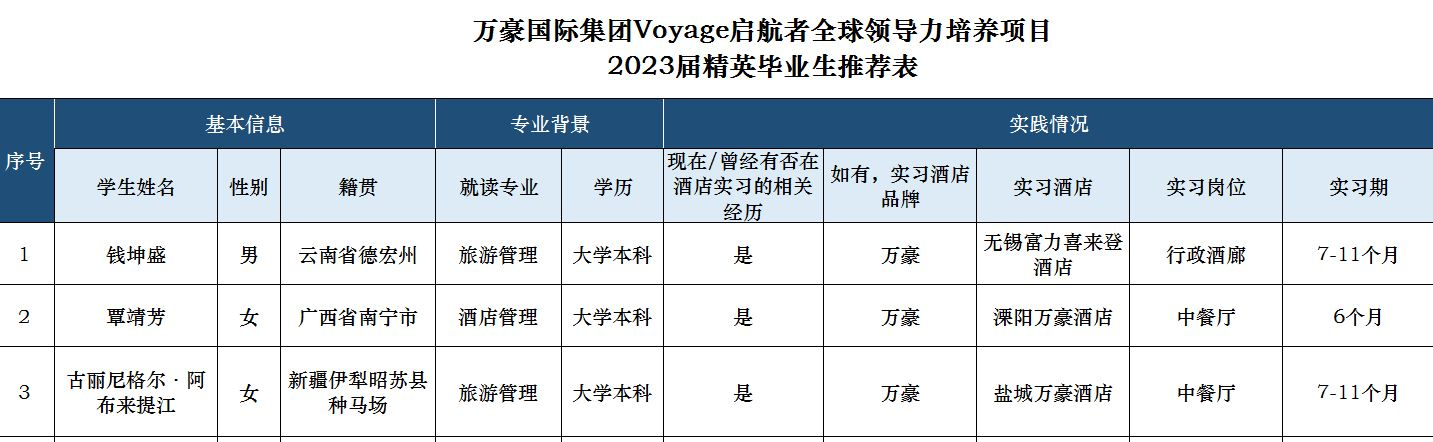 9月7日下午,公司组织推荐毕业生参加万豪国际集团启航者全球领导力培养项目选拔。公司领导对此高度重视,通过员工自主报名、各班长推荐人选和专业老师筛选的方式,最终推荐了3位同学参与到项目评选,具体人选名单公布如图。