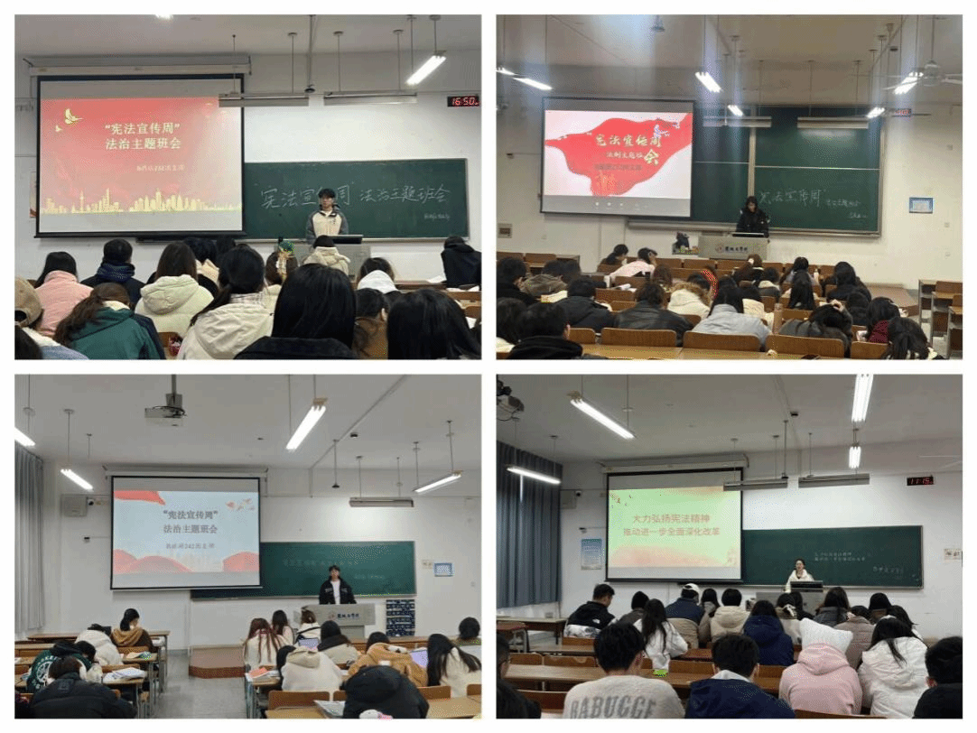12月1日至12月4日,球盟会各班级召开“大力弘扬宪法精神,推动进一步全面深化改革”主题班会。班会中,各班级通过讲解PPT、播放宪法主题微视频及发放宪法宣传单等形式,认真学习了宪法和国旗法、国歌法、国徽法等宪法相关法,深入了解新中国宪法发展历程和宪法的地位作用,并通过剖析法治实践中的经典案例以及学习优秀法治人物的事迹和风采,有效促进了法治观念在同学们心中的内化与深化,未来立志成为宪法的积极求知者、忠实执行者、热情传播者及坚定守护者。